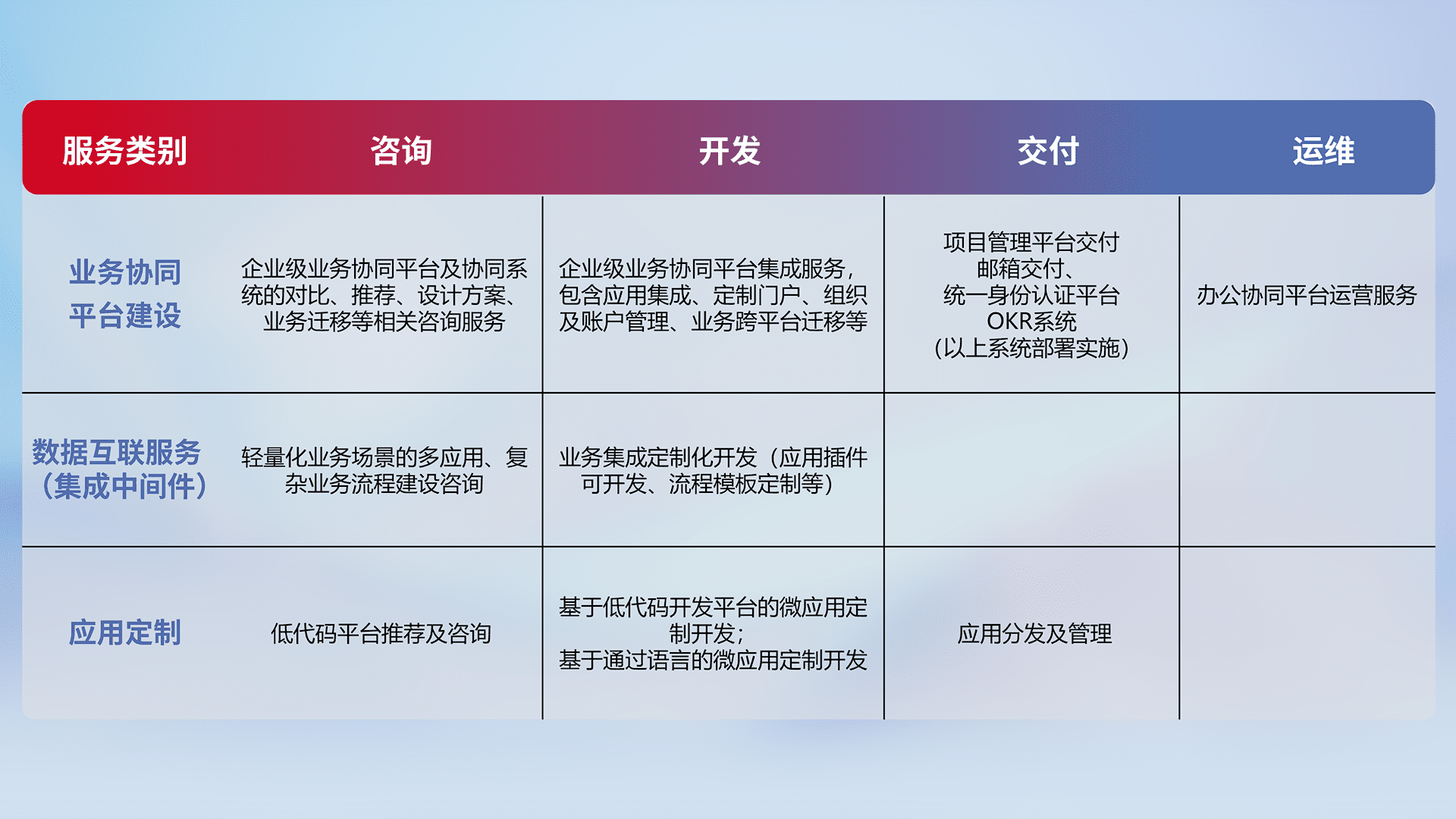 针对钉钉、、企微、、、IDaas等平台级产品提供产品的规划、、方案、、、交付、、、定制化开发等服务,,实现如统一协同办公、、、智能客户服务、、、、混合会议管理、、智能数据查询、、等业务场景,,,,实现数字化转型。。。。