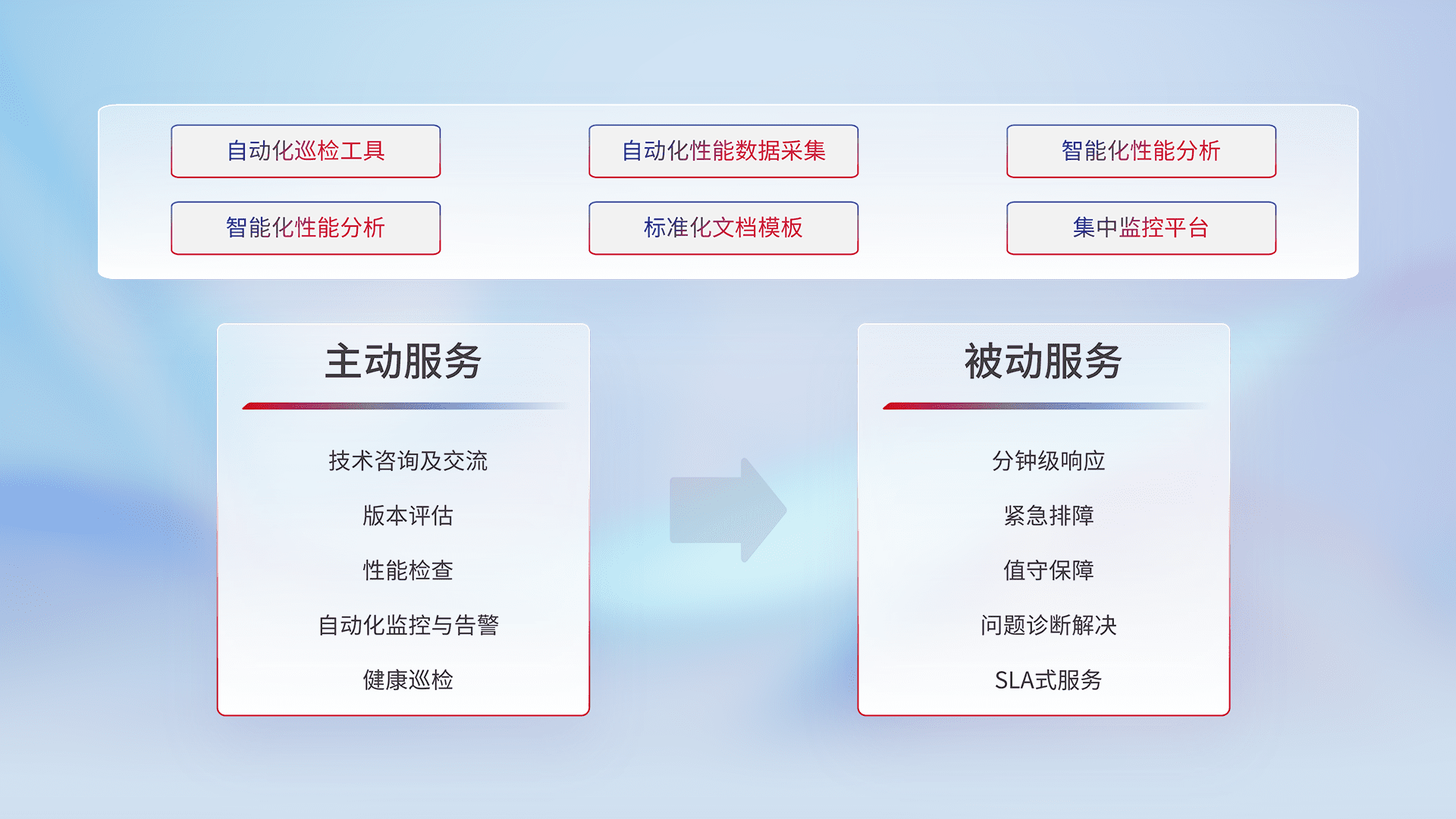 智能化工具和标准化文档,,,保障服务质量,,,提供主动服务(包含技术咨询、、版本评估、、、、性能检查、、、、自动化监控与告警、、、健康巡检)和被动服务包含(分钟级响应、、、紧急排障、、、值守保障、、、、问题诊断解决、、、、SLA服务)。。